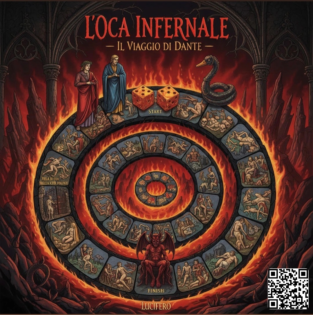 Dimentica il tranquillo laghetto delle oche. In questa rivisitazione oscura e dantesca del classico gioco da tavolo, la posta in gioco è la tua anima. Vestendo i panni di Dante, Beatrice o Virgilio smarriti nella “selva oscura”, dovrai discendere attraverso i gironi dell’Inferno in un percorso a spirale verso il centro del dolore ricco di quesiti e ostacoli.